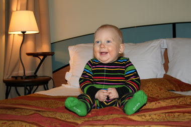 Aron naureskelemassa hotellihuoneessa